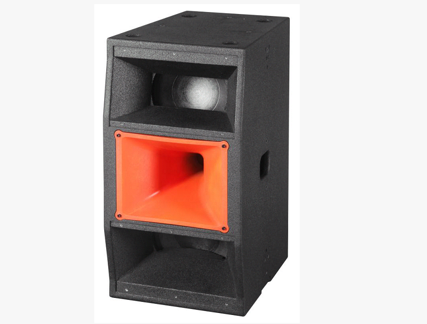 10寸纸盆低音钕磁单元前置相位塞加号角,中频部分由1只74mm(音圈)钕磁复合膜压